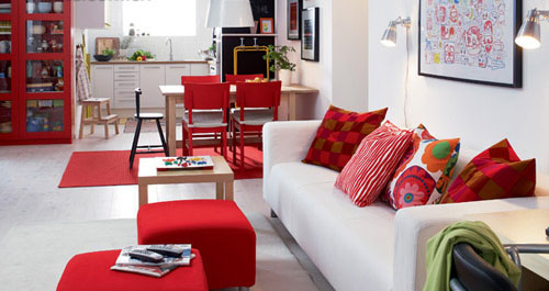 以鮮亮的圖案與素色的物體形成對比,以襯托背景。純正紅色的沙發坐墩渲染了空間的氣氛,使得白色的基礎色不再寡淡,呈現出勃勃的生機,充滿活力。色彩相間、純度很高的窗帷和靠包,賦予了室內活潑、青春的氣息。