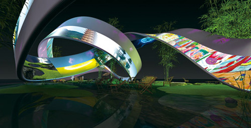 ????湖南館取名為“都市·桃花源”,建筑外觀像一尊巨大的動態雕塑,難得的是主體建筑的外圍與屏幕連成一體,將有魚翔淺底、落英繽紛、碧水綠草、竹林幽谷等景致在上面呈現。湖南館沒有像其他館一樣設置參觀路線,觀眾可以從該館的數個方位進出,隨意觀看。 “魔比思環”播放屏將采用竹和紙的結構,通過在紙上涂上特殊涂料,達到細膩投像效果。