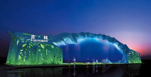????吉林館的主題是“長白山下放歌行”,設計者充分借助“師法自然”的手法,不僅在展館外形上參考了長白山山脈的形象,并通過多媒體手段展現長白山的鳥語花香。在互動體驗區,參觀者將受到噴射冷氣的“襲擊”,感受到陣陣寒意的同時欣賞到吉林霧凇的奇妙美景。