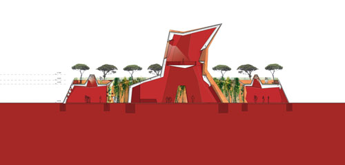 ????為了讓參觀者有一個舒適方便的參觀環境,展館做了不少人性化的設計。展館設計了眾多出入口,可以不需排隊等待,隨時根據自己的喜好停留、參觀。參觀者可以根據自己的喜好觀看展館里的視頻內容,或者登上植被覆蓋的屋頂,在長椅上小憩,欣賞周圍的美景。在開放的翼樓上,還有為孩子們設計的游戲娛樂場。