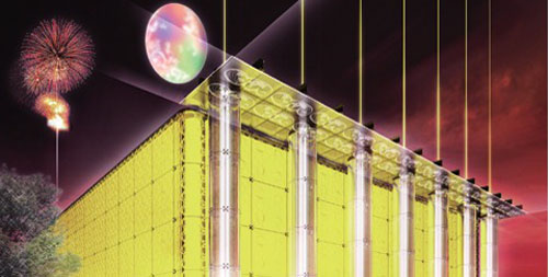 ????展館運(yùn)用“液體玻璃”技術(shù),這種無(wú)色無(wú)味的透明液體,可以像油漆一樣地涂刷在建筑物表面,24小時(shí)后,液體便會(huì)凝固成玻璃,晶瑩剔透。入館處,有7根直徑超過(guò)1米的羅馬立柱,四周裹以透明玻璃,柱內(nèi)利用水立方,即水的落差瞬間,用電腦編程,形成“大愛(ài)無(wú)疆”等字樣和圖案,循環(huán)演示。柱內(nèi)的水將分別從太平洋、大西洋、印度洋、北冰洋、地中海、南極洲、紅海等地采集和灌入。每條“水簾”上的文字,將根據(jù)采水地進(jìn)行選取,如英文、中文、拉丁文、阿拉伯文等。一進(jìn)入展館,半照明空間的頂部懸掛著數(shù)萬(wàn)個(gè)小燈珠。燈珠閃亮,將有各種圖案閃現(xiàn),仰望展館的上部,有著時(shí)空流轉(zhuǎn)的效果,體現(xiàn)“光立方”的奧妙所在。