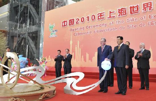 5月1日,中共中央政治局常委、全國政協主席賈慶林在上海世博園世博中心出席中國2010年上海世博會開園儀式。這是賈慶林和國際展覽局主席藍峰共同啟動按鈕,為上海世博會開園。新華社記者 黃敬文 攝