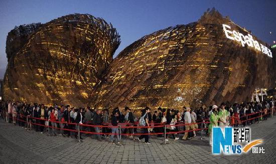 5月1日,游客在傍晚排隊等待進入西班牙館參觀。當日,上海世博園正式開園迎客。新華社記者戴旭明攝