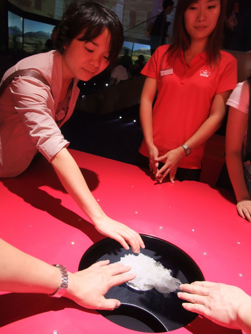 在列支敦士登展館,阿爾卑斯山水晶通過(guò)鏡面反射的原理顯現(xiàn)在展臺(tái)上,記者近距離觸碰才知是“鏡花水月”。