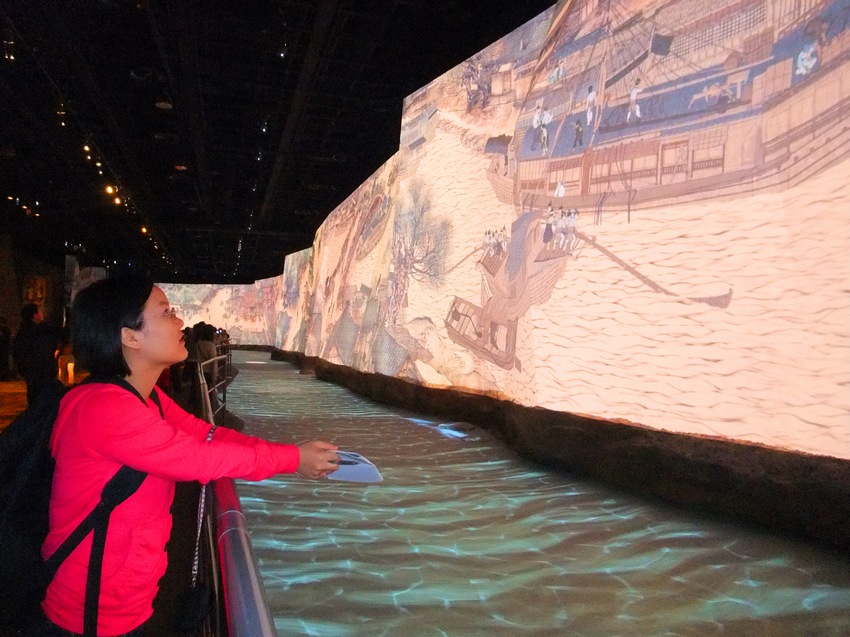 ????在畫里的一個角落,我們看到一位商人拉著幾匹運貨的馬,在鄉間村道悠閑地走著;幾個小童在路邊盡情地玩耍。我們突然有了一個奇怪的想法:這個馬隊會不會是在不停地原地踏步呢?旁邊那個轉圈的小孩會不會一直這樣轉下去?等我們往前走幾步再回頭看,馬隊和孩子都已經不見了。才發現原來這個大型動畫,并不是簡單的機械重復,而是融入了情節和情感的歷史活書。而真正的國寶《清明上河圖》原件,也在右邊墻的背面展出,讓參觀者親睹這件中國著名文物的攝人魅力。