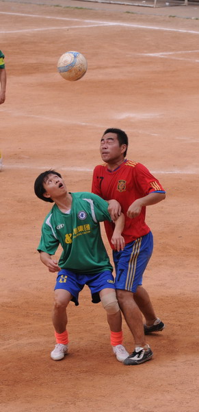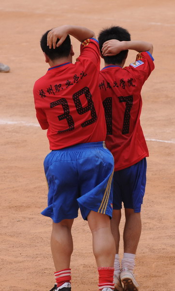 對方罰任意球,這兩名隊員自我保護。 韋世寧 攝