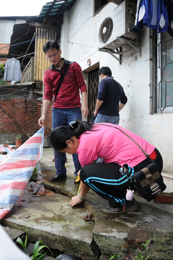 ????在文瀾路17號(hào)門前,工作人員邊用卷尺量度裂縫的裂口長(zhǎng)度,邊把監(jiān)測(cè)結(jié)果進(jìn)行認(rèn)真登記,和此前登記的數(shù)據(jù)進(jìn)行比較,并向附近的居民了解隱患點(diǎn)的情況。而早在汛期來(lái)臨之前,工作人員已經(jīng)用三色布對(duì)這些裂縫進(jìn)行覆蓋,平時(shí)也堅(jiān)持每天對(duì)這些裂縫所在的區(qū)域進(jìn)行巡查,并將險(xiǎn)情第一時(shí)間告知附近住戶,提醒他們注意觀察,預(yù)防意外情況的發(fā)生。