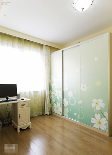 書房的布置十分簡潔,僅有書桌、書房跟這一大大的儲存柜充斥其中。然而在搭配上卻極其巧妙。碎花圖案的淺綠色窗簾、布滿了隨風飄蕩的花朵的柜門、春意盎然的背景墻,置身其中猶如步入春天的田野之中。