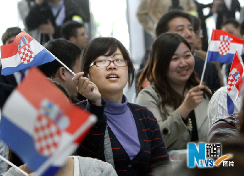 ????5月15日,在世博中心,游客在觀看克羅地亞國家館日的歌舞表演。當日,上海世博會克羅地亞館舉行國家館日活動。 新華社記者劉穎攝