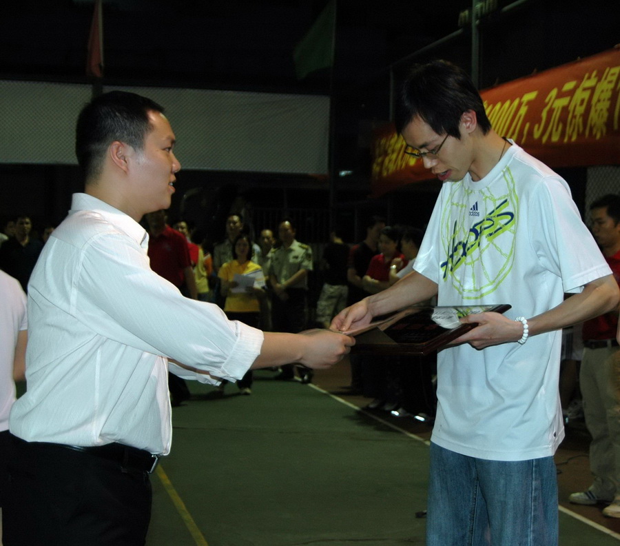 梧州金爵臺球俱樂部經(jīng)理余立堅為臺球比賽獲獎隊伍頒獎
