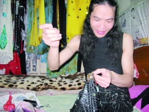 ????記者來到覃保生租住的房子樓下時,剛好碰到他正和街坊們談論自己新做的演出服。“這些珠子還不夠閃亮,還可以更炫一些。”樓下小店的廖阿姨向覃保生建議。“我覺得也不需要太閃,這樣也可以。”覃保生堅持自己的眼光,但說話語氣很溫和。附近的街坊都知道這里住著一位熱愛肚皮舞的男子,最近還參加了選秀大賽,還上了報紙。他們對覃保生跳肚皮舞和參加比賽這件事情非常支持,還經常給他“支招”。