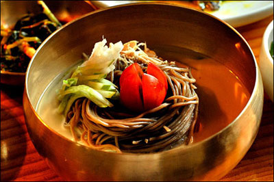 ????面條是著名的主食品。面條按所用的的材料可分為白面面條、蕎麥面條、淀粉面條、玉米面條等。在小麥多產(chǎn)的南部地區(qū),那里的人常吃白面面條。但是人們最喜歡吃的還是蕎麥面條,平壤冷面就是用蕎麥面做的。平壤冷面條細(xì)而韌,面湯涼爽,酸甜可口。