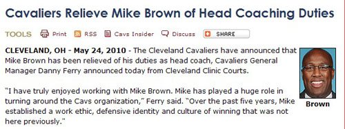 ??? 北京時間5月24日消息,克利夫蘭騎士在今日正式宣布提前解除邁克?布朗的主教練職務,布朗在執教騎士期間戰績不俗,但惟獨缺少總冠軍獎杯。