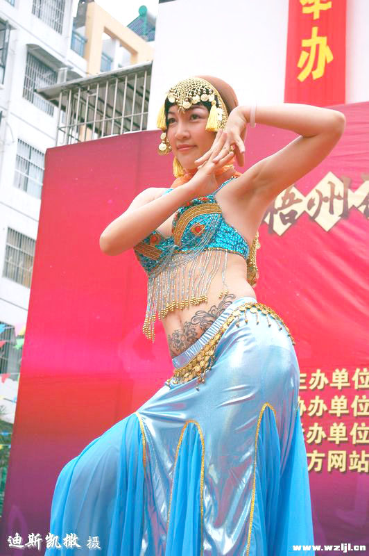 點評:豐腴婀娜的身段,姣好的臉龐,身著一襲鑲滿亮片的藍色異域華服,邱少麗隨著神秘輕快的音樂扭動著柔軟的腰肢,演繹性感的古埃及肚皮舞,她的優雅、性感、嫵媚展露無遺,臺下的觀眾、評委無不被她的美、她的氣質所吸引。有著美貌與形體的先天優越條件,又加上扎實的肚皮舞基本功與她完美的演繹,邱少麗無疑將是夢想飛翔舞臺上一抹亮麗的顏色。