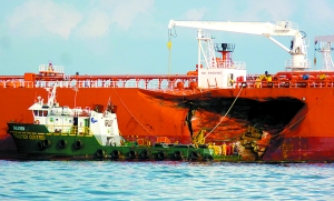 25日,與貨船相撞的馬來西亞籍油輪的左舷上出現一道10米長的裂縫,且出現漏油。當事兩船目前已離開相撞地點,停泊在新加坡。