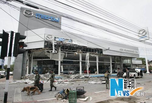 ????5月26日,在泰國南部也拉府,警察在爆炸現場調查。泰國警方26日說,泰南部也拉府當天發生兩起炸彈襲擊事件,造成至少2人死亡、27人受傷。警方認為泰南分離主義武裝人員制造了這兩起襲擊。 新華社/路透