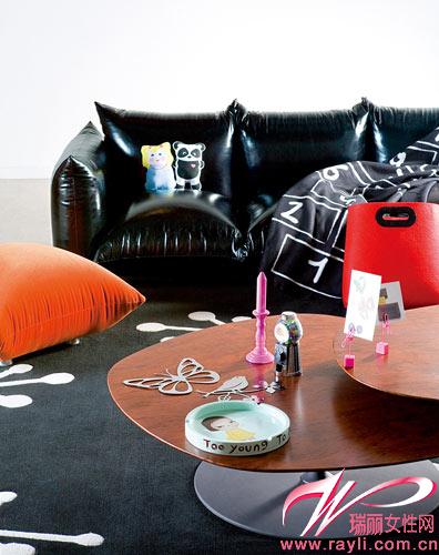 黑色的多人沙發(fā)像是吹足了氣的氣球,十分有趣,玩偶小靠包和畫著“跳房子”圖案的蓋毯讓整個(gè)沙發(fā)童趣盎然,就連茶幾上的裝飾也透著幾分無邪。