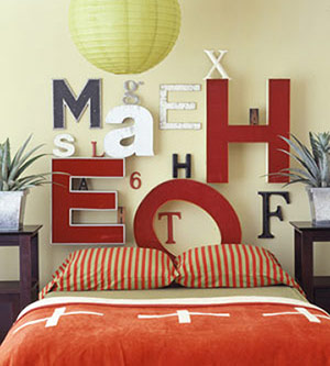 大小不一的立體英文字母與數字不僅可以起到裝飾墻面的效果,最大的E和H上還能充當置物架,臨時擺放物品。紅、白、灰三色分別對應臥室內其他軟裝的顏色搭配。