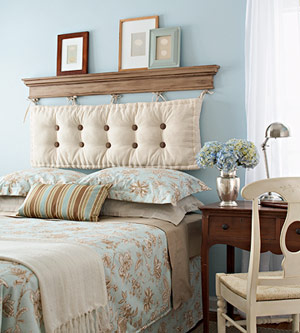 變廢為寶,將兩扇舊窗木框安置于床頭的背景墻上,在木框內嵌入與床品相似的布織品,巧妙的將其融入整體之中。