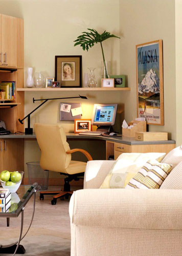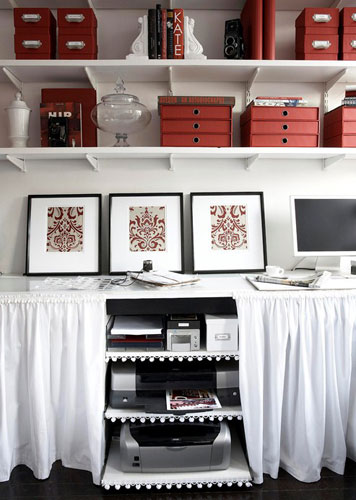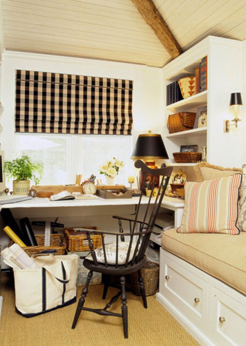 利用起居室的一面墻,就可創造出一個節省空間的辦公區域。幾塊隔板、一張緊靠墻的長書桌,白色的裙擺桌圍不僅舒緩了辦公區慣有的緊迫感,而且還能巧妙地遮掩住收納于桌下的雜物。