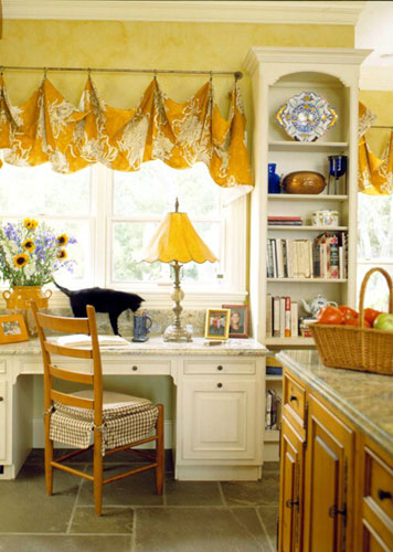 法式鄉村風格的家庭辦公區,明亮溫馨的黃色調,書桌與書架都充分利用了墻面的空間。
