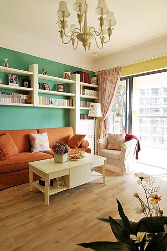 清新的綠色沙發(fā)背景墻,用定制的白色整體書架作為裝飾,除了收納書籍,還能展示照片和裝飾品。搭配橙色的宜家沙發(fā)和田園落地?zé)簦尶蛷d充滿青春時(shí)尚的感覺。