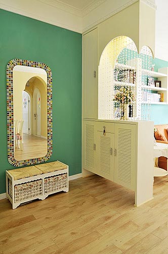 玄關(guān)以鞋柜作為入門隔斷,用珠簾和鮮花打造出浪漫的氛圍。綠色背景墻上用馬賽克圍繞著一面簡潔的穿衣鏡,下面搭配田園風格的換鞋凳,簡潔又有創(chuàng)意。