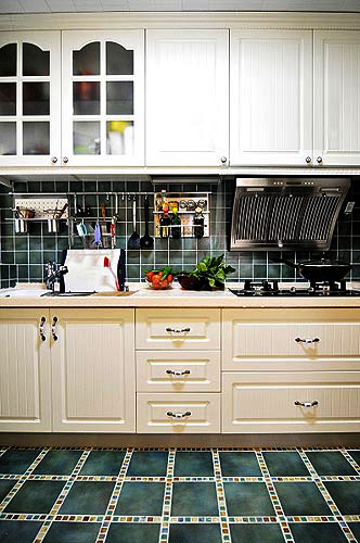 青綠色復古瓷磚,與馬賽克拼花構成的地面,活潑俏麗。再加上純美的白色田園風格櫥柜,讓小廚房充滿清新的感覺。