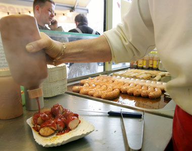 ?美食介紹:將美味多汁的特制香腸切成塊,澆上番茄醬,再撒上咖喱粉和辣椒粉即成,它的味道可絕不同于紐約熱狗。