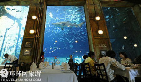 ????“貨倉”餐廳建造在一個大型海洋公園之內,整個餐廳是一艘船,船身大部分沉入水下,各色魚群在沉船周圍游來游去,運氣好的食客還能親睹著名的德班大白鯊的風采。這里的菜肴以海鮮為主,最具特色的是牡蠣大餐。酒足飯飽之后,人們還可以沿著樓梯走到銹跡斑斑的甲板上散步。