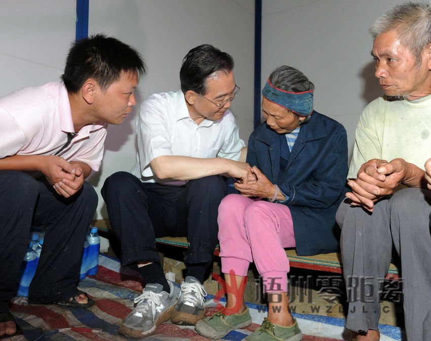 ??? 這是6月20日,在蒼梧縣沙頭鎮雙尚村小學操場受災群眾安置點,溫家寶總理走進村民林保蘭居住的臨時板房內,握著她的手安慰她節哀保重。70多歲的林保蘭在災害中失去了3位親人。新華社記者李濤攝
