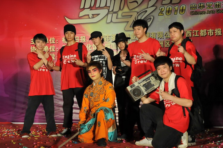 ????7月10日晚,“夢想飛翔”舞蹈專場決賽現場,梧州市街舞運動協會在舞臺拍照慶祝。韋世寧/攝?