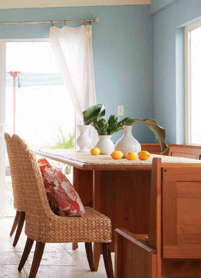 ??? 找幾只款式不同的白色花瓶擺放在餐桌上,與白色和紅色花朵靠墊相呼應,輕薄的白紗窗簾,在海風吹拂下輕柔起舞,成為最美的風景。