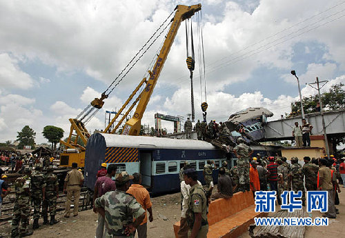 7月19日,在印度東部西孟加拉邦賽恩提亞的一個火車站,救援人員起吊發(fā)生相撞事故的火車車廂。新華社發(fā) |