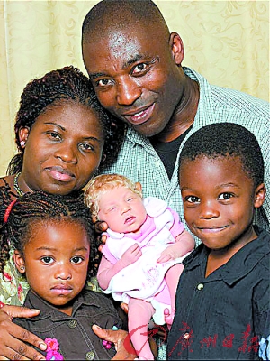 ????本報(bào)訊 據(jù)英國媒體20日報(bào)道,一對英國黑人夫婦近日生下一個金發(fā)藍(lán)眼的白皮膚女兒,不僅讓這對父母大惑不解,也讓遺傳學(xué)家十分困惑;而醫(yī)生們已經(jīng)表示,這個嬰兒并沒有得白化病。
