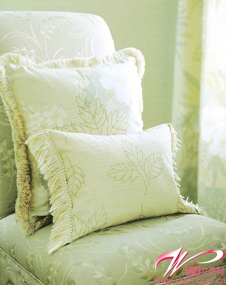 ????靠墊邊緣上的流蘇突出輕盈設計感,更添活潑氣氛。葉子圖案與床頭裝飾畫相呼應。簡約印花布藝的坐椅有光亮的色澤,透露著低調的華麗。