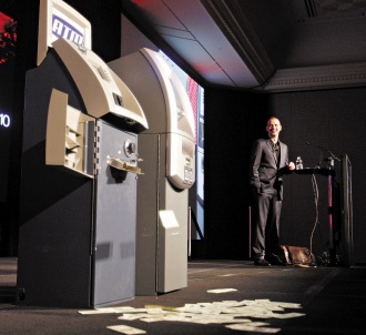 西雅圖信息安全專家杰克28日在拉斯維加斯計算機安全會議示范破解自動柜員機,破解后鈔票果然不斷吐出。
