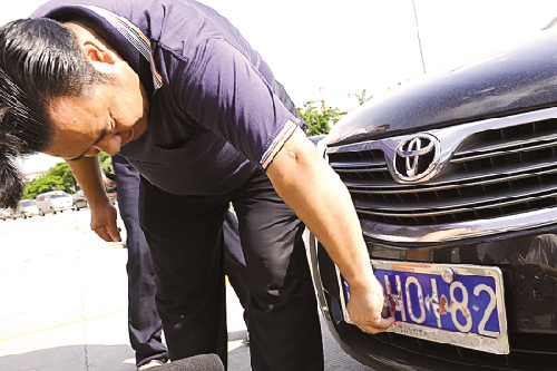 同樂檢查站,一位車主未撕掉號牌上的紙屑,因為號牌模糊,這位車主被罰6000元。(圖片來源:羊城晚報)