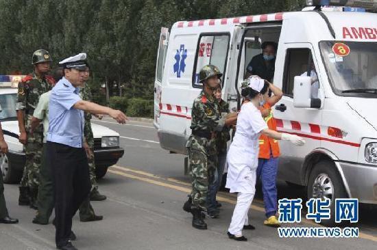 8月16日上午,醫務人員將受傷群眾扶上救護車。