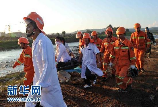 8月16日,工作人員從爆炸現場抬出一位傷者。新華社記者王建威攝