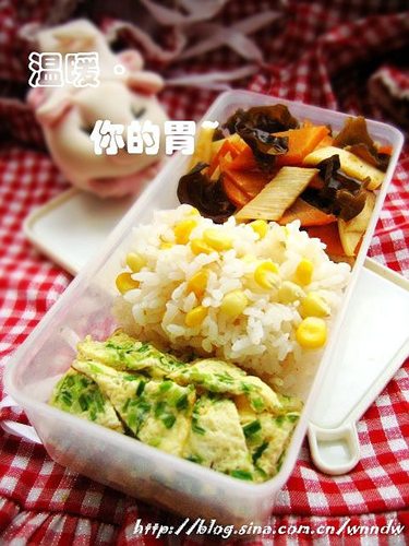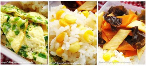 ??? 這款便當的主食是玉米飯,配菜有切成小塊的小蔥雞蛋餅、粗纖維豐富的胡蘿卜茭白炒木耳。
