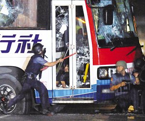 ????“我們是在上午10點30分左右收到消息的。領隊偷偷地在大巴的后座給我們香港總部打來電話,告訴我們這一消息。他匆匆忙忙說了幾句,就掛斷了電話,”香港康泰旅行社總經理劉美詩告訴《中國日報》記者。劉美詩介紹說,“槍手上車之后不準游客下車,并勒令香港游客集中在車后。”