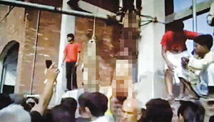????據(jù)報道,巴基斯坦新聞頻道近日播出了一段有關(guān)私刑的血腥視頻,其中兩名十幾歲的少年被執(zhí)行私刑的暴徒輪流用棍棒毆打致死,血淋淋的尸體被吊起來示眾。更令人震驚的是,這個殘忍的刑罰是在眾目睽睽下進行的,圍觀的數(shù)十人中甚至有幾名警察,但是整個過程中沒有任何人試圖阻止暴行。