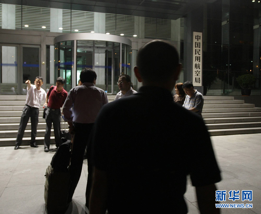 ??? 2010年8月25日 民航總局工作組趕往黑龍江伊春 8月24日,21時35分左右,河南航空有限公司一架ERJ-190型飛機在伊春機場失事。民航局領(lǐng)導(dǎo)率工作組連夜趕往現(xiàn)場。這是工作人員在北京中國民用航空局前準備出發(fā)。新華社記者 邢廣利 攝