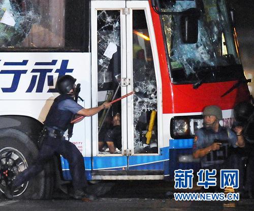 ??? 資料圖片:8月23日,在菲律賓首都馬尼拉,警察從被劫持的大巴中救出一名人質。香港康泰旅行社一個旅行團23日上午在馬尼拉遭到劫持。 新華社發(魯埃勒·烏馬利攝)
