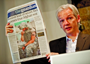 ????資料圖片:7月26日,倫敦,“維基解密”網站創始人朱利安·阿桑奇召開新聞發布會,他手拿一份《衛報》,報上頭條就是此次“泄密事件”。