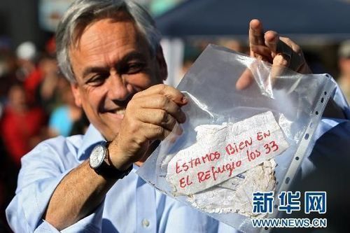 ????2010年8月22日智利塌方銅礦33人被困17天后仍生還8月22日,在智利北部城市科比亞波附近,智利總統(tǒng)皮涅拉展示塌方銅礦被困礦工寫的“我們?nèi)?3人仍然活著”字條。 新華社/法新社
