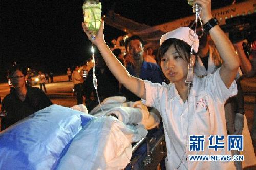??? 8月25日晚,在哈爾濱太平國際機場,醫(yī)護人員準備將一名伊春空難傷員送往醫(yī)院。當晚,伊春空難中的15名傷員搭乘南方航空公司包機抵達哈爾濱,隨后被送入當?shù)厮募裔t(yī)院接受進一步治療。 新華社發(fā)(張清云 攝)