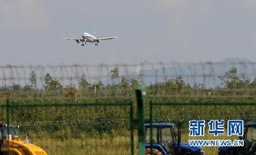 ??? 8月26日,一架飛機即將降落在黑龍江伊春林都機場。當日,于8月25日暫停使用的黑龍江省伊春市林都機場恢復使用,開始正常航班起降。 新華社記者李勇攝