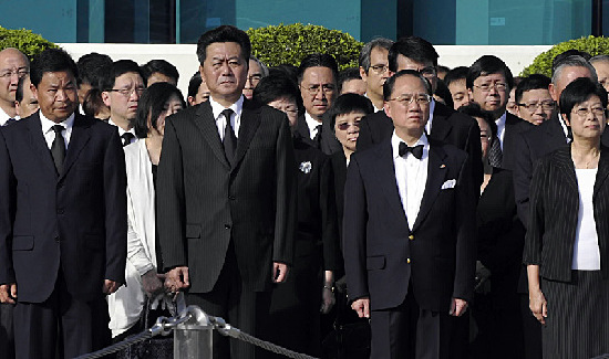 ???? 資料圖片:8月26日,香港特別行政區行政長官曾蔭權(前右二)、中央政府駐港聯絡辦副主任李剛(前右三)、外交部駐港特派員公署特派員呂新華(左一)等向遇難者志哀。新華社記者黃曉勇攝